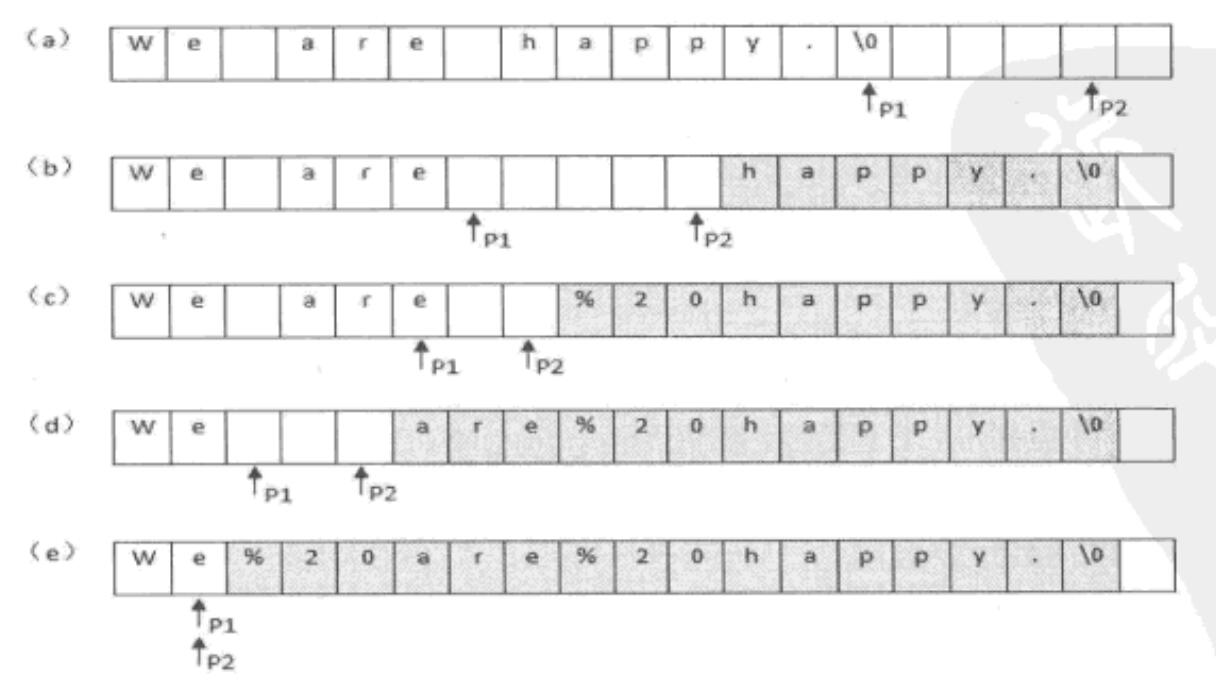 以”We are happy”为例,”We are happy”这个字符串的长度为14(包括结尾符号”\n”),里面有两个空格,因此替换之后字符串的长度是18。我们从字符串的尾部开始复制和替换。首先准备两个指针P1和P2,P1指向原始字符串的末尾,P2指向替换之后的字符串末尾。接下来向前移动指针P1,逐个把它指向的字符复制到P2指向的位置,直到碰到第一个空格。碰到第一个空格后,P1向前移动1格,P2位置开始向前插入字符串”%20”,同时P2向前移动3格。